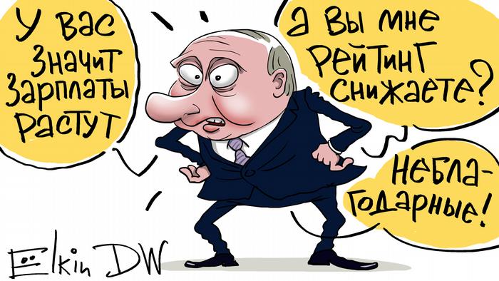 Карикатура Ёлкина Самые свежие данные ВЦИОМ о доверии россиян к Путину и прочим персоналиям и органам власти показывают снижение рейтингов доверия и одобрения. Не такое резкое, как неделю назад, но снижение. Такое складывается ощущение, что россияне до сих пор не поняли, как им относиться к действиям власти на фоне корона-кризиса. Тем более, что действия какие-то совершено мутные….115 - Общество