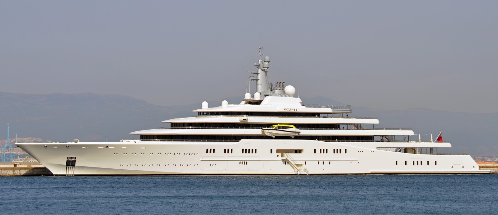 Фото: супер-яхта Eclipse. Яхта имеет две вертолетные площадки, 24 гостевые каюты, два бассейна, несколько джакузи и диско-зал. На яхте имеется также три шлюпки и подводная мини-лодка, которая способна погрузиться на глубину до 50 метров. Для управления яхтой нужно приблизительно 70 членов экипажа. Ее длина составляет 164 метра.