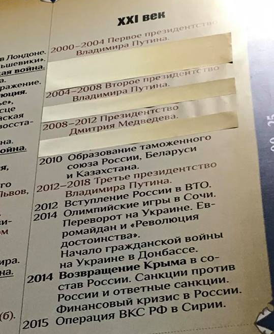 Говорят, что в павильоне истории России на ВДНХ, на стене висит большая таблица всех важных событий российской истории в периоде «от Рюрика до Путина». Четыре события времен Путина заклеены. Также говорят, что заклеенными оказались даты, которые связаны с гибелью подводной лодки «Курск» в августе 2000 года, захватом террористами «Норд-Оста» в Театральном центре на Дубровке в октябре 2002 года и терактом в Беслане в сентябре 2004 года.